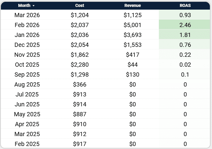 Conditional formatting on the “ROAS” column helps it stand out from the others.