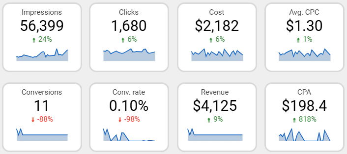 For this type of report, I like to start with a high-level “scorecard” layout that highlights top metrics over a set period of time (usually last month or the last 30 days). The scorecard chart is simply a one-metric box that can report on any available metric. When you group these scorecards together, the data is presented in a way that’s simple, clean, and easy to digest.
