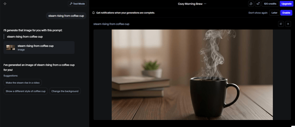 Example use: A café brand prompts Runway with “steam rising from a coffee cup” and produces a realistic product shot for social ads and campaigns.