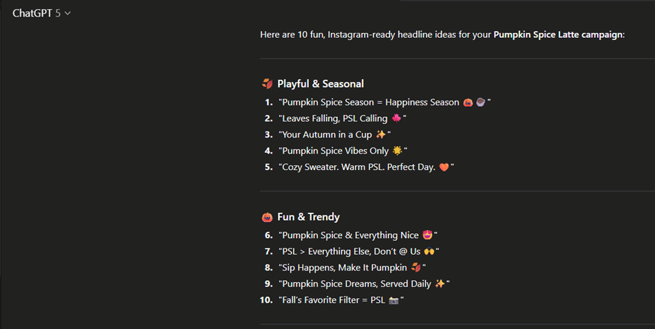 Example use: A coffee chain asks ChatGPT for 10 fun, Instagram-ready headlines for a pumpkin spice latte campaign.