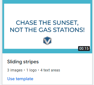 This is where you can access the Video Builder tool, which features 6- or 15-second video templates with options for each orientation (horizontal, square, and vertical). Each template is similar to a slideshow; each will allow you to add a logo, upload images, and create text in front of a plain background, but with simple animation. The number of images and text you can add varies by template. For example, the “Sliding Stripes” 15-second template allows you to insert one logo, three images, and features three text boxes (two with a 40-character limit and one with a 22-character limit).