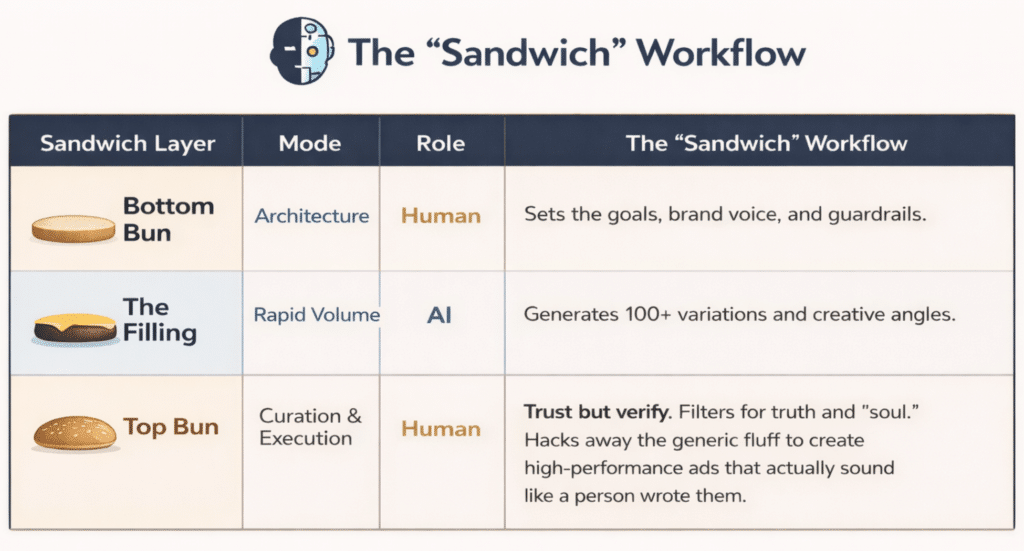 Instead of viewing AI as an “Author,” view it as a “Research Assistant.” We use a Sandwich Workflow to balance machine speed with human judgment.