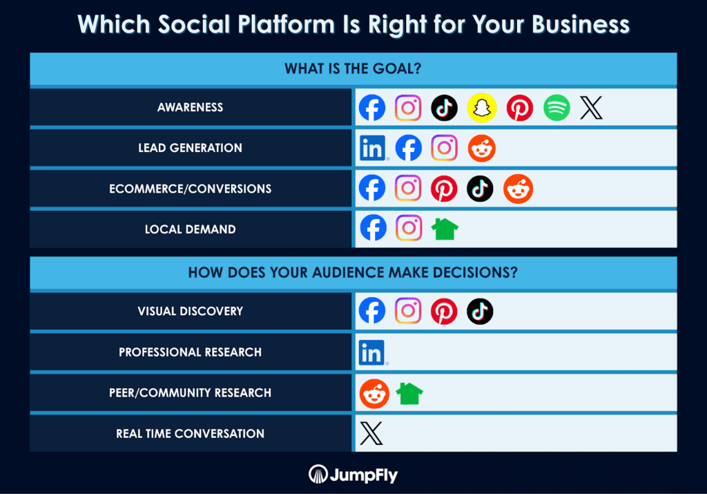 - What are you trying to get out of it? Sales, leads, awareness, app installs, and local demand do not all call for the same social media platforms.
